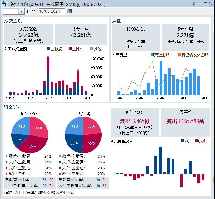 中芯錄得約3.47億元資金淨主動賣出,佔成交金額達24%,規模不容忽視。(《經濟通HV2報價系統》截圖)