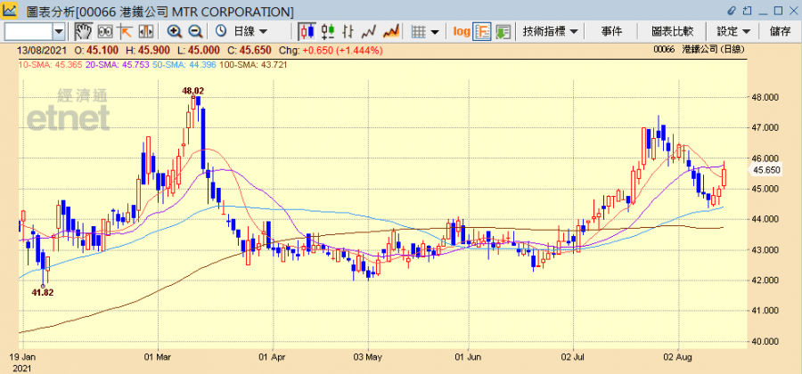 港鐵半日升1.44%收報45.65元。