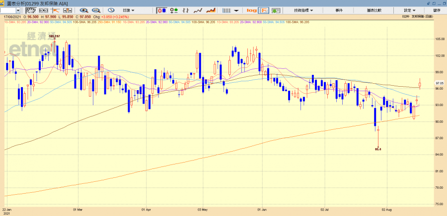 友邦(01299)股價三連升,逼近百元關。(經濟通HV2系統截圖)