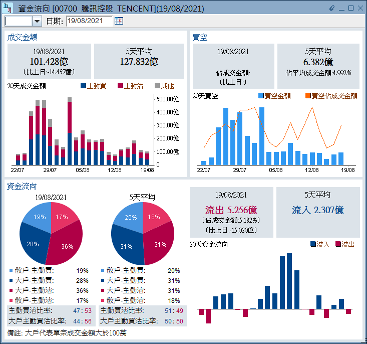 雖然騰訊上日績前獲近10億資金淨主動買入,但今早沽家已掉頭沽貨。根據《經濟通HV2報價系統》數據,騰訊半日錄5.25億淨主動賣出,佔其成交金額5.18%。大戶,即單宗成交金額大於100萬元的交易的主動買沽比率為44:56,反映大戶沽家比買家更為進取。