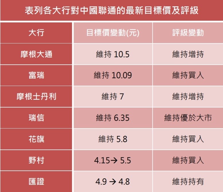 多家大行中,只有匯證下調聯通目標價。其報告認同,聯通上半年收入及EBITDA與預期相符,而稅前盈利及淨利潤則受聯營公司和合資企業的高利潤份額帶動而優於預期。而聯通也跟隨其他同業加息,該行重申其「持有」評級,但考慮到長期網絡和人員成本,故將目標價由4.9元下調2%至4.8元。