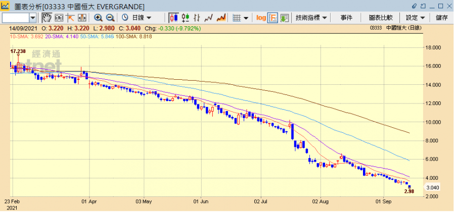 中國恒大(03333)債務危機憂慮不斷發酵,繼上周傳出暫停支付銀行貸款到期利息,以及被惠譽穆迪等降級後,今周負面消息仍不絕,昨日就有大批投資者圍堵深圳總部要求還錢,而9月物業銷售料持續大跌,理財產品又未能履行擔保義務,出售恒大汽車(00708)及恒大物業(06666)股份方面亦沒甚進展,一些美元債亦跌至違約水平,可謂負面消息一籮籮,拖累恒大系股價今日(14日)再度全線急挫。