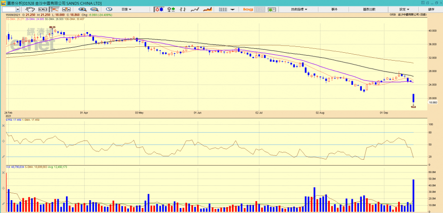金沙中國今早急挫,並創18元上市後新低。(經濟通HV2系統截圖)