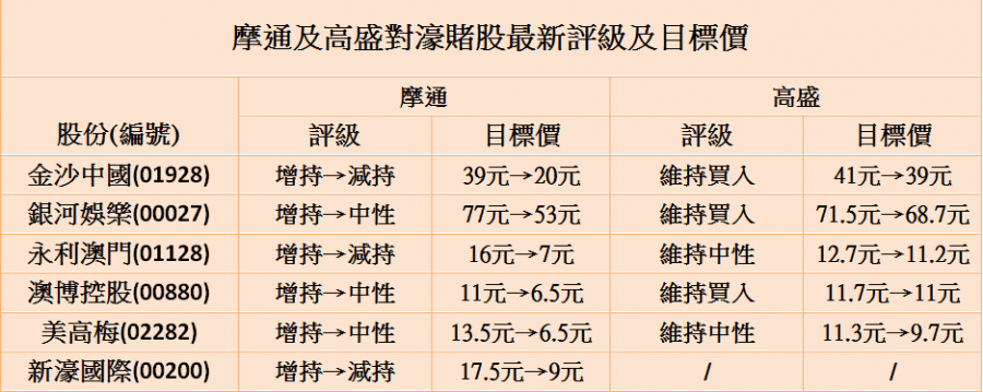 摩根大通發表研究報告指,政策信號表明在賭場即將更新賭牌的過程中,監管對資本管理和日常運營的審查將更加嚴格。雖然實際監管和執行水平仍是爭論的焦點,但已令投資者大為憂慮,足以令濠賭股降級。該行下調永利澳門、金沙和新濠國際評級至「減持」,下調銀河娛樂、澳博和美高梅評級至「中性」,並大降目標價, 永利澳門和金沙分別由16元和39元下調至7元和20元,銀河娛樂、澳博和美高梅則分別由77元、11元和13.5元下調至53元、6.5元和6.5元。另高盛雖維持銀河娛樂、澳博和金沙買入評級,但下調目標價,分別由71.5元、11.7元和41元下調至68.7元、11元和39元。