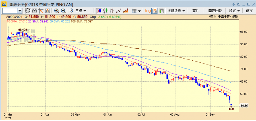 中國恒大(03333)債務危機持續發酵,負面消息不絕,最新消息,旗下恒大財富已啟動實物資產兌付,將恒大的住宅和商舖等按售價打折後兌付給投資者,並對提前贖回投資產品的管理人員予以懲處,網絡上亦謠言四起,搞得人心惶惶,而標普繼惠譽、穆迪後亦調低恒大評級,恒大今日(20日)股價再挫逾一成。另一方面,據報部分中資銀行亦開始對恒大可能倒閉做準備,已計提部分貸款損失,並準備對部分短期貸款進行展期,拖累內銀股急跌。而上周市場憂慮內地因房地產市場資金鏈問題而引起的連鎖效應,內險股繼內房股之後捱沽,其中需為華夏幸福(滬:600340)作巨額減值撥備的中國平安(02318)(滬:601318)股價仍未止瀉,繼上周五(17日)跌半成後,現急挫近7%持續尋底。