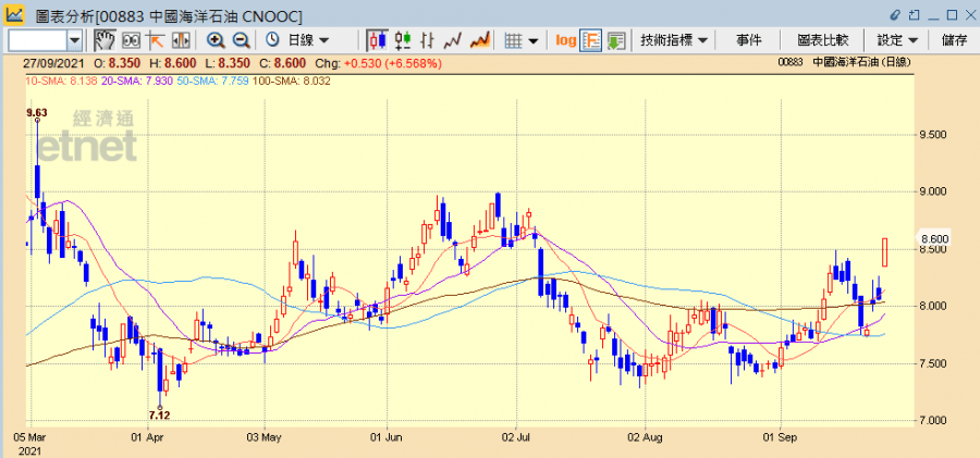 中海油受消息刺激開升3.47%報8.35元,其後升幅擴大,現(10:55am)升6.57%報8.6港元,成交12.94億元,連升三日累升10.26%。中石油(00857)則升1.58%報3.86港元,連升四日累升4.61%,中石化(00386)亦升1.3%報3.89港元。