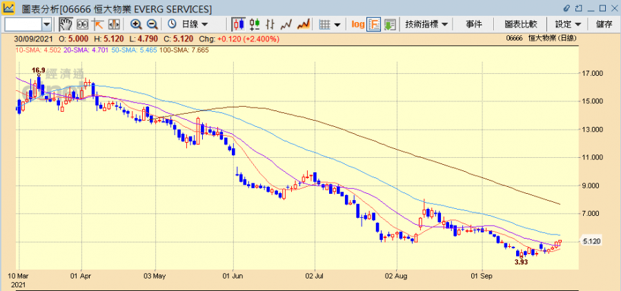 合生創展(00754)停牌涉收購一家在聯交所上市之公司股份,及可能要根據香港收購及合併守則而對相關公司的股份提出強制要約。收購的公司股份市傳正是恒大物業股份,恒大現持有60.96%恒大物業。截至上周四(9月30日)收盤,恒大股價報2.95元,今年以來縮水79.14%,市值剩下390.88億元,而恒大物業則報5.12元,市值553.51億元,今年以來下跌了五成四,預測市盈率跌至10倍左右,估值吸引。