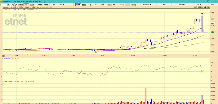股價方面,海昌於10月11日進一步破頂創2.8元新高,惟於尾盤約3時25分忽然遭戲劇性拋售,股價一度大瀉逾五成,最終收報1.7元,跌0.98元或36.6%。據海昌今日(12日)公告透露,正在與一家獨立第三方的亞洲私募股權基金進行交易協商,交易可能包括股份買賣協議、戰略合作協議等,實屬有利消息,但詳情仍有待公布。現時股價反彈至2元以上,迫近十天線,若消息成真,短線有利股價表現,短線目標暫看頂位2.8元,長線而言,若上述提及的跟進項目表現良好,則股價有望續創新高。