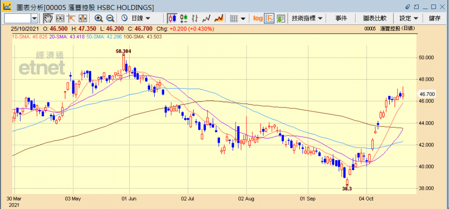 不過,匯控業績持續改善及重啟股份回購其實都在市場預期之內,股價此前多少已有所反映,因此在業績公布後匯控雖曾升逾1%,但其後股價回順,最終收市微升0.43%收報46.7港元。至於其他本地銀行股則升跌不一,恒生(00011)升0.07%收報145.9港元,中銀香港(02388)跌0.2%報24.9港元,渣打(02888)升0.48%報52.3港元,東亞(00023)跌0.31%報12.88港元。