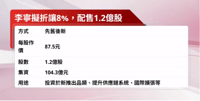 李寧(02331)公布以先舊後新方式配售1.2億股,佔擴大股本4.59%,每股作價87.50元,比上日收市價折讓8.09%,集資淨額104.3億元,用作投資於新推出品類,國際擴張,投資於重組基礎設施及進一步提升供應鏈系統,並於機會出現時作未來業務投資,亦會用於品牌建設及一般營運資金。配股完成後,主要股東非凡中國(08032)在李寧的持股由10.87%攤薄至10.37%。