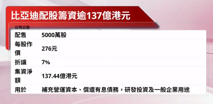 《伸手不弱》比亞迪配股抽水137億元 分析指後市仍可看高一線