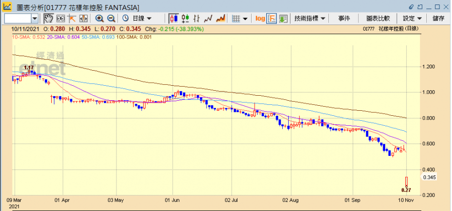 其實,花樣年近日已遭百大集團(滬:600865)告狀,指其杭州項目公司未按期償還債務本息。百大公告於今年6月18日,以自有資金向杭州鴻同企業管理合夥企業出資1億元人民幣,通過杭州星昂企業管理合夥企業向杭州花浦房地產開發有限公司發放借款,由花樣年提供保證擔保,惟截至11月5日杭州花浦尚未按期償還債務本息。另花樣年公布,10月銷售額約21.08億元(人民幣.下同),較去年同期的55.22億元,按年下跌61.8%。相應已售建築面積為約16.6萬平方米,按年跌49.3%。