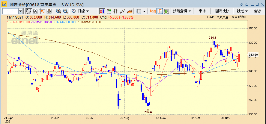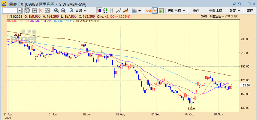 今日電商平台股先跌後回升,阿里現(3:20pm)升1.3%報163.3港元,京東升1.88%報313.8港元,小米則升3.16%報21.25港元。