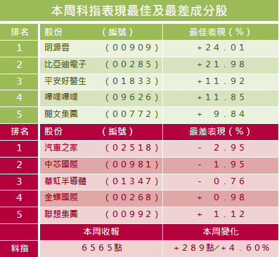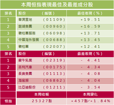 恒指本周在24481點至25527點間波動,上下波幅1046點,全周升457點或1.84%,收報25327點,日均主板成交1257億元,按周少近3%。國指本周在8679點至9186點間波動,上下波幅507點,全周升293點或3.33%,報9114點;科指本周在6151點至6604點間波動,上下波幅453點,全周升289點或4.61%,報6565點。