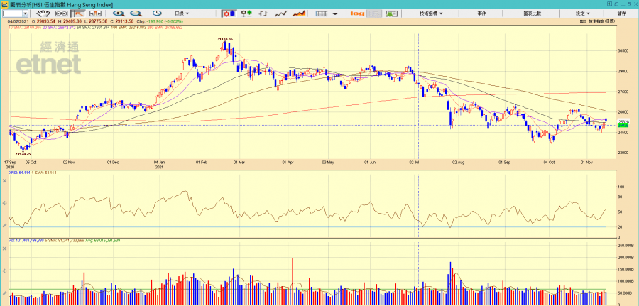大市本星期由周三起開始有資金流入,主要因為內房有望鬆綁,容許以發債融資解決流動性風險問題。周內騰訊(00700)公布的第三季業績亦未有太大驚喜。恒指周三起的升浪至周四成功收復十天線,惟今日高開突破廿天線後獲利盤湧現,未能收高於廿天線約25400。