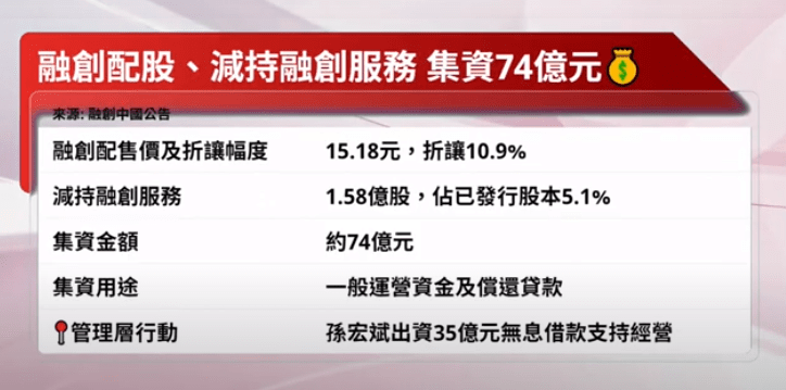 融創公布,以先舊後新方式,按每股15.18元發行3.35億股新股集資50.85億元,並以每股14.75元配售融創服務1.58億股,套現約23.31億元,共籌74.16億元。融創每股新股配售價較上周五(12日)收報17.04元折讓約10.9%,新股佔擴大後股本約6.7%,而配售的股份將配售予不少於6名獨立第三方,任何承配人將不會因配售事項成為主要股東。孫宏斌及其一致行動人士持股由45.29%攤薄至42.25%。