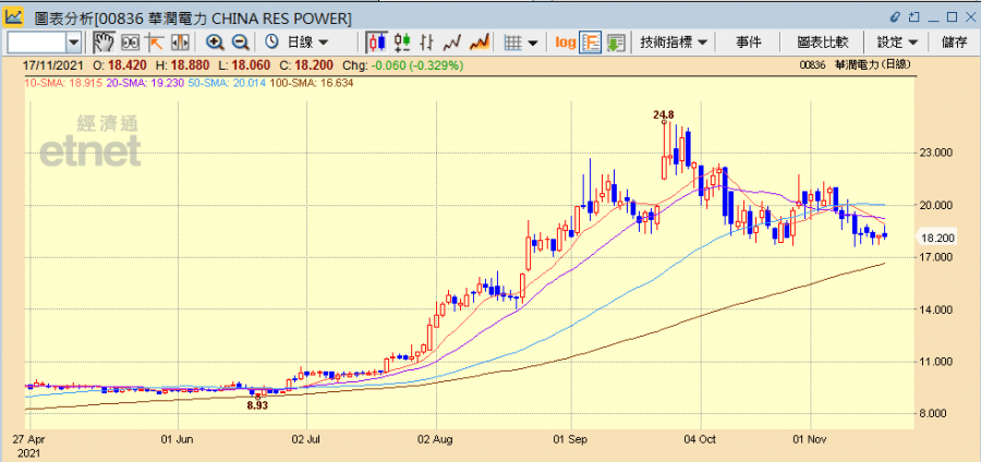 內地電力公司早前一直受困於限電限產措施及煤炭價格高企,產能和盈利均受影響,其後中央就保障電力及煤炭供應都做了工作,國務院副總理韓正昨日(16日)在北京出席今冬明春保暖保供工作電視電話會議時,強調要繼續增加電煤供給,並依法查處哄抬煤炭價格行為。另方面,最近公布的10月份數據亦顯示電力及煤炭產能都得到釋放有所增長,刺激一眾中資電力股今日(17日)曾全線上升,惟午後無以為繼跟隨大市下跌。