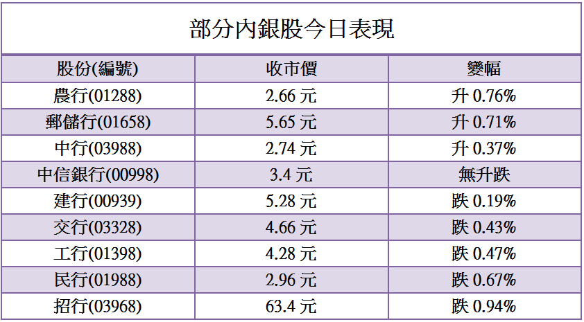 內銀股今日普遍逆市靠穩,其中農行、郵儲行及中行(03988)都有升幅。