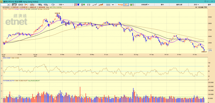 再看今天大市成交額,較上日縮減378億元,5天平均成交不足1500億元。即使直至昨天為止,北水連續第13個交易日錄得淨流入,對港股亦無甚支持,加上臨近年尾,不少基金早已收爐,年終市況實在不容樂觀。從日線圖看,恒指全年呈一浪低於一浪走勢,而目前保力加通道底部已去到21995點,沒有利好消息推動下,本周恒指有機會再向下試兩萬二,投資者可將部分資金買少量熊證作對沖。