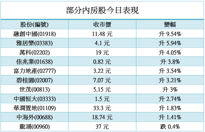 中央鼓勵優質房企併購同業項目 內房股普遍反彈