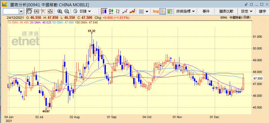 今日平安夜,港股只有半日市,中移動升0.9元,升幅近2%收報47.5港元,成交8.69億港元。
