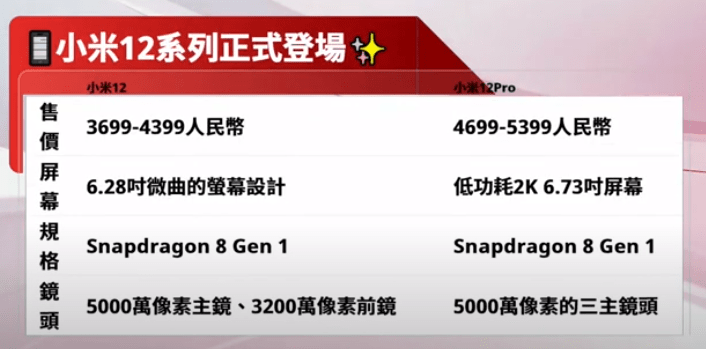 配置上,手機搭載驍龍8 Gen1芯片,6.28英寸AMOLED屏幕。配備4500mAh強勁續航電池。50MP高清主攝,採用索尼IMX766旗艦傳感器,以及13MP超廣角、長焦微距相機。價格方面,小米12共有三個容量版本,8GB+128GB版3699元(人民幣.下同),8GB+256GB版3999元,12GB+256GB版4399元。小米12 Pro搭載120W小米澎湃秒充,在疾速模式下18分鐘可充滿,50W無線秒充,42分鐘可以充滿。小米手機產品經理發文介紹,研發小尺寸旗艦手機需大量研發成本及新材料成本,主板成本提升25%,高密度快充電池成本上升14%,立體聲成本上升31%,超薄均熱板VC成本上升22%。