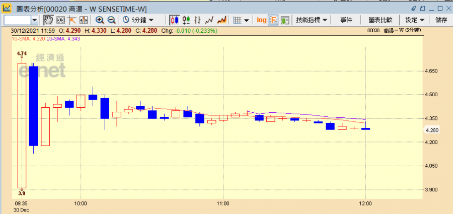 今天(30日)有三隻新股首掛,其中早前被美國列入黑名單而暫緩在港上市的中國人工智能軟件公司商湯(00020)最矚目。以今日股價表現所見,商湯無受美國制裁影響,高開1.56%報3.91元,其後升幅擴大至23.12%高見4.74元,半日仍升逾一成。另泉峰控股(02285)及聖諾醫藥(02257)亦於今日掛牌,半日分別升約兩成半及兩成。