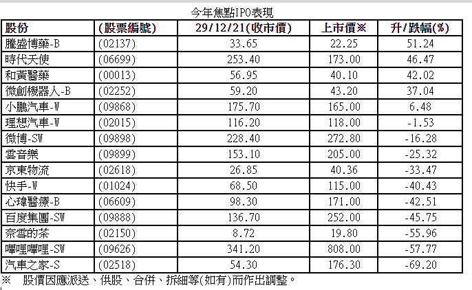 港股IPO市場萎縮,今年港股共計有94間企業進行IPO,集資總額達3237億元,兩項數據分別下降35%及19%。IPO集資額規模由去年世界排名第三,跌至今年的第四。直至截稿當天,今年升幅最大的新股為森松國際(02155),升幅近360%,相對醫藥行業新股表現較差,最差的貝康醫療(02170)上市以來累跌超過七成,18隻生科B股IPO有15隻下跌。