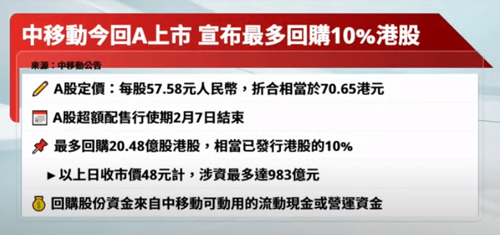 另外,中移動董事長楊傑於A股IPO網上路演時表示,已制定了上市後三年內穩定公司A股股價預案,並運用綠鞋資金保障A股上市後的後市穩定。他又提到,如果股價長期重大偏離真正價值,可考慮在適當時機回購股份。而中移動早前在港交所公告,於2021年3月26日股東周年大會上,股東授權董事會在香港聯交所購回香港股份。從公司A股超額配售行使期2月7日結束,公司將可回購不超過20.48億股香港股份,相當於不超過股東周年大會當日已發行香港股份數目的10%。若以昨日收市價48元計算,涉及資金最多達983億元。中移動指,用以回購股份的資金全部來自中移動可動用的流動現金或營運資金。