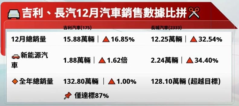 至於長汽上月銷量16.2萬輛,按月增32.5%,其中新能源車銷量按月增34.4%,至2.2萬輛。全年累計銷量按年增15.2%,至128.1萬輛,超越全年目標121萬輛;新能源車銷量則按年飆近1.4倍至13.7萬輛。從全年銷量比較,長汽與吉利的差距逐步收窄,前者更保持高速增長。由此可見,兩家車企的競爭今年將進入白熱化階段。