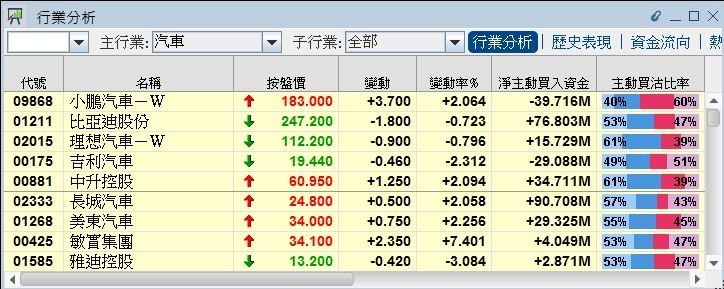 兩家車企銷售數據榮辱互見,同樣在股價上反映。吉利早段最多插4.9%,低見18.92元,創去年五月以來新低,其後跌幅收窄,惟全日仍跌2.31%,收報19.44元。長汽最多飆6.58%,惟其後升勢回順,全日升2.06%,收報24.8元。比亞迪(01211)逆市跌0.72%,收報247.2元。