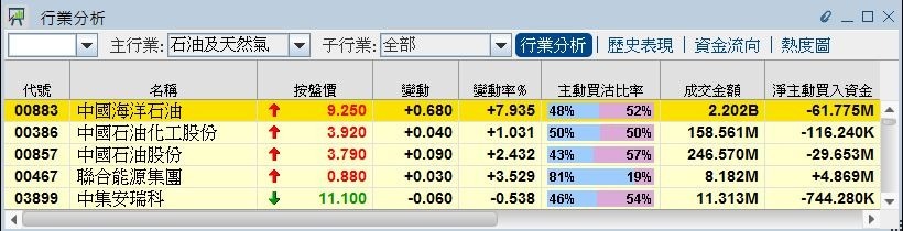 受救價組合拳推動,中海油早段最多飆逾11%,高見9.52元,創去年三月以來最高,其後升勢略為回順,半日仍升7.94%,收報9.25元。中石化及中石油亦跟升,分別升逾1%及2%,收報3.92元及3.79元。