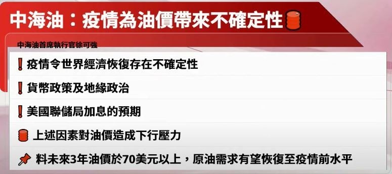 國際油價去年大幅反彈,中海油料未來三年油價處於70美元以上,但影響油價的不確定性仍有很多,包括疫情、貨幣政策、地緣政治、美國加息等,料今年原油需求有望恢復至疫情前水平,全年供需維持「緊平衡」狀態。