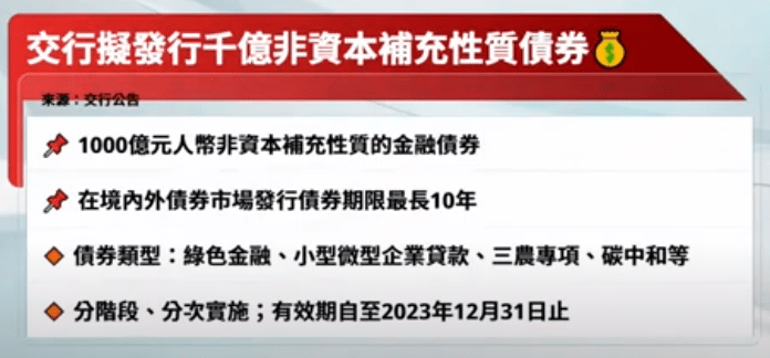 交通銀行公布,董事會批准發行金融債券,在境內外債券市場發行不超過等值1000億元非資本補充性質的金融債券,包括普通金融債券、綠色金融債券、小型微型企業貸款專項金融債券、「三農」專項金融債券、碳中和債券等。該行指,可在有效期內分階段、分次實施,債券期限不超過10年,而發行方案及授權有效期自董事會批准起至2023年12月31日止。