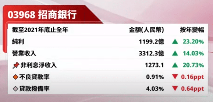 招商銀行去年純利為1199.22億元,按年增長23.2%;營業收入按年增14.03%至3312.34億元。截至2021年12月31日,集團資產總額為9.27萬億元,較上年末增加10.9%;負債總額8.4萬億元,較上年末增加10.14%;不良貸款率0.91%,較上年末下降0.16個百分點;撥備覆蓋率441.34%,較上年末增加3.66個百分點;貸款撥備率4.03%,較上年末減少0.64個百分點。