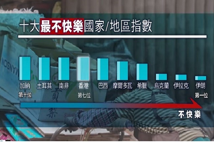 缺乏土地引起的房屋、養老、空氣等種種問題,令香港成為全球最不快樂的地區之一 (團結香港基金報告截圖)