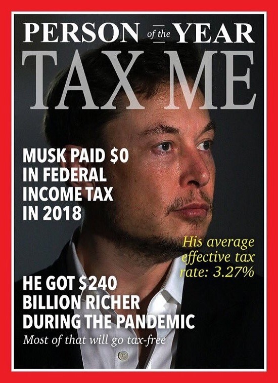 不過,印有馬斯克側臉特寫的雜誌封面,「Time」大字隨即被改圖為「Tax me」,最新爆料指,馬斯克2018年繳納聯邦所得稅為零;民主黨進步派參議員伊麗莎白沃倫明言,「讓我們修改被操縱的稅法,這樣『年度人物』就會真正納稅,並停止從其他人身上佔便宜(freeload)。」