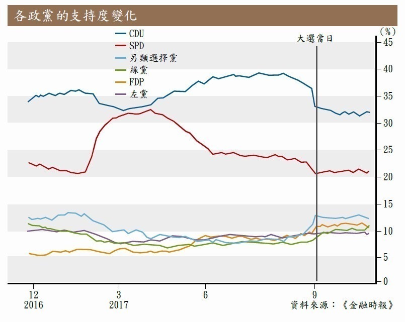 9月的德國大選,結果是默克爾所屬的基督教民主聯盟(CDU)及其姊妹黨基督教社會聯盟(CSU)得票最高贏出;惟33%的得票率為,乃自二戰以來的最低水平。另一方面,上屆與CDU及CSU合組政府的社會民主黨(SPD)續成第二大黨,卻拒絕再做執政聯盟中的老二,迫使默克爾要改與FDP及綠黨合組政府。可惜FDP在周日公布因與CDU及綠黨存在無法解決的分歧,故退出聯合執政的談判。