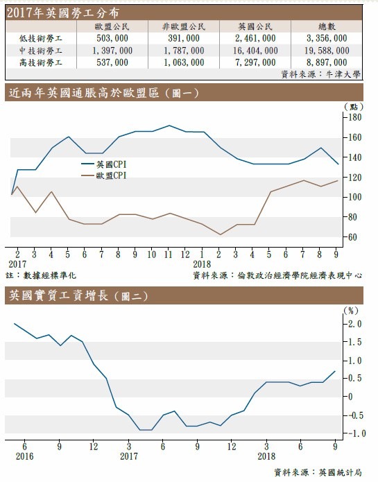 何謂結構性轉變?他舉例指,洗車機於十多年前一度在英國賣得成行成市,但由於聘請洗車工人的成本較低,令洗車機不敵人類的雙手,慘遭淘汰。同樣道理,收緊移民政策令歐盟的低技術工人大幅減少,即時推高勞工短缺及工資成本,企業會反過來以科技解決人手問題。這種結構性轉變會出現在多個行業,最終威脅到英國工人的生計,最後得不償失,事關低技術的歐盟勞動力佔整體市場高達15%(見表)。