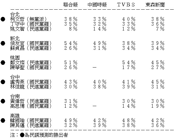 「九合一選舉」倒數第四天,依台灣法律規定,選前民調已於上周三封關,而最後民調就顯示,國民黨有望贏得六都中的新北、台中及高雄,而台北亦未打定輸數。