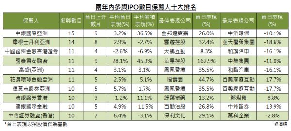 而過去兩年,整體參與新股發行次數最多的十大新股保薦人中,不乏熟悉的名字(見表),中銀國際亞洲為參與了15次新股上市,冠絕同行,當中9隻首日上升,平均累積表現為升36%。若按所保薦的新股表現來看,國泰君安融資,除了量亦有質,任11次保薦人中有9次該股首日上揚,平均累積表現為升46%。代表作是華星控股(08237),首日勁升163%,而經手最差表現的是中集集團(02039),首日蝕11%。