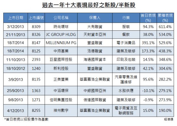 過去12個月,當中累計表現最差十大新股及半新股中(見表),他們的保薦人不乏琅琅上口之名牌,如德意志、大摩、摩通、法巴、瑞銀、建銀國際等。而最近出事的諾奇(01353)就是由建銀國際任。反而,同期表現最好的十大新股(見表)卻有不少是較少人熟悉的投行作保薦人。