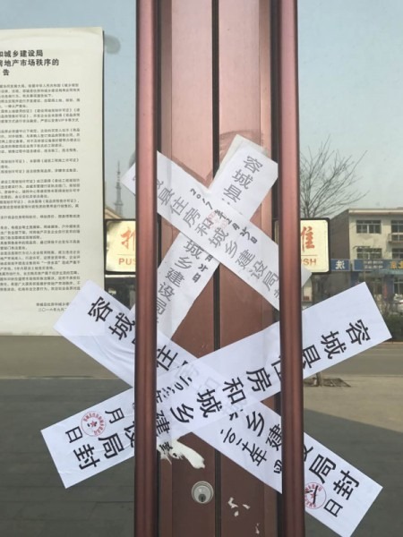 雄安新區在全國引起轟動,為了防止房地產市場可能出現的震盪,地產爆炒。三個縣及周邊部分區域召開緊急會議,要求禁止一切炒房行為,更一刀切停止所有樓市交易,封掉了城區的售樓處和房產中介公司。在容城,記者連續走過容城5、6間房地產中介公司,全部被封和關門,門上貼上層層封條,查封日期是4月2日,新封條的底下,還有舊封條,顯示2月份中介公司也曾被查封。今年2月23日,國家主席習近平專程到河北省進行實地考察,雖然當時尚未正式公布,但民間已有臆測,2月查封之後,或許有的中介公司又重開。