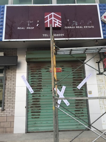跟容城一樣,這裡的房地產中介公司都已被查封,馬路邊兩家地產中介公司被查封關門,查封日期均是4月2日,一家公司的玻璃門內,地面散落了幾張紙,上面有聯繫地話和QR