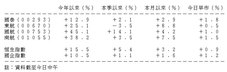 表列國泰航空及中資航空股股價表現
