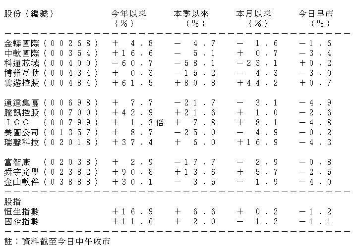 表列部分科網及科技股股價表現