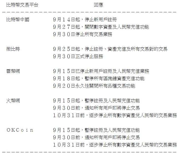 一行三會等七部門於9月4日將代幣發行融資(ICO)定性為未經批准非法公開融資行為,即時叫停各類ICO活動。內地多個主要比特幣交易平台先後宣布暫停新用戶註冊、人民幣充值、停止交易等措施,表列有關回應: