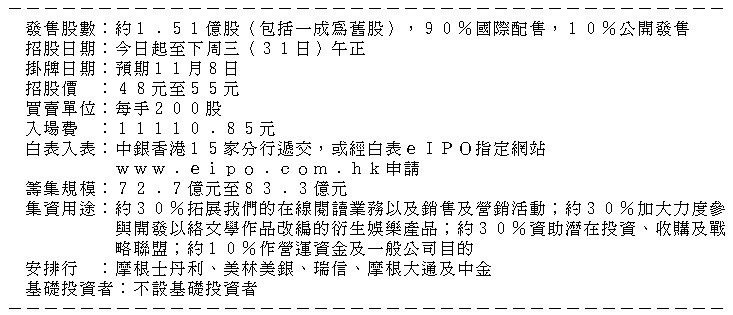 閱文業務收入主要來自月費收入及版權,後者包括把該平台上的文學作品轉為電影等作品時收取的版權費。李偉傑預料,該股在中線能有40%至50%有升幅,建議投資者不用急於掛牌頭一星期就馬上沽出,本月初掛牌的眾安,股價亦需要幾天才真正「發力」。眾安在本月3日掛牌,掛牌第三天企90元水平以上收市,第四日高見97.8元,比上市價高出逾六成;而周三(25日)收報80.65元,持貨者仍有35%回報。