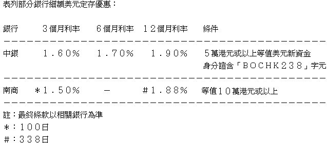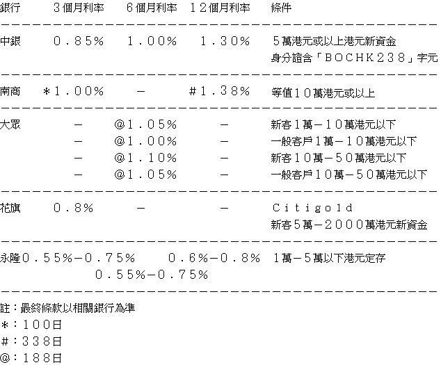 新股熾熱,抽乾市場資金,本港銀行為吸取更多存款,近期紛紛提供定存優惠,利息收益已貼近同業拆息。如中銀香港(02388)為慶祝中國銀行在港服務100周年,推出的「BOCHK」高息定存,特定客戶5萬元或以上的新資金起跳,港元和美元3個月利率分別有0.85%及1.6%,之間的息差高達0.75%;6個月港元和美元新錢定期利率分別1%和1.7%。