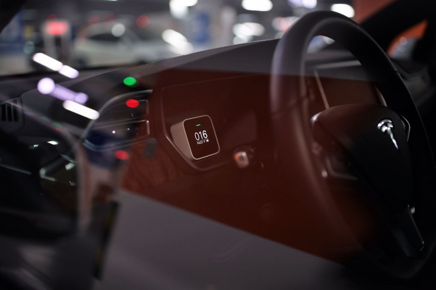 特斯拉在展示HEPA空氣過濾系統,開啟後車內PM2.5很快由車外的逾80μg/m3降到低於20μg/m3,使用「生化武器防禦模式」後,進一步降低至9μg/m3 (駐滬記者王嘉寧攝)